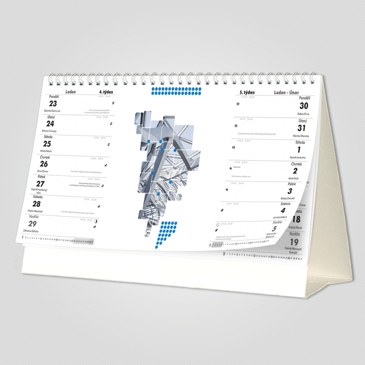 SKC01Tento typ kalendáře je často využíván pro rychlý přehled o dvou týdnech v rámci jednoho pohledu.. Kalendář obsahuje celkem 34 stran, včetně titulní stránky, stojánek z kvalitního kartonu, kroužkovou vazbu v horní části.
