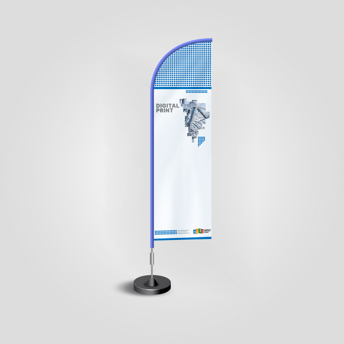Design reklamní vlajky je obvykle barevný a nápaditý, s cílem přitáhnout pozornost diváků. Loga, obrázky, texty a grafika mohou být tištěny na obou stranách vlajky, což zajišťuje viditelnost z různých úhlů. Tisk je proveden termotransferovou metodou, která zaručuje dlouhou životnost a vysokou kvalitu.
